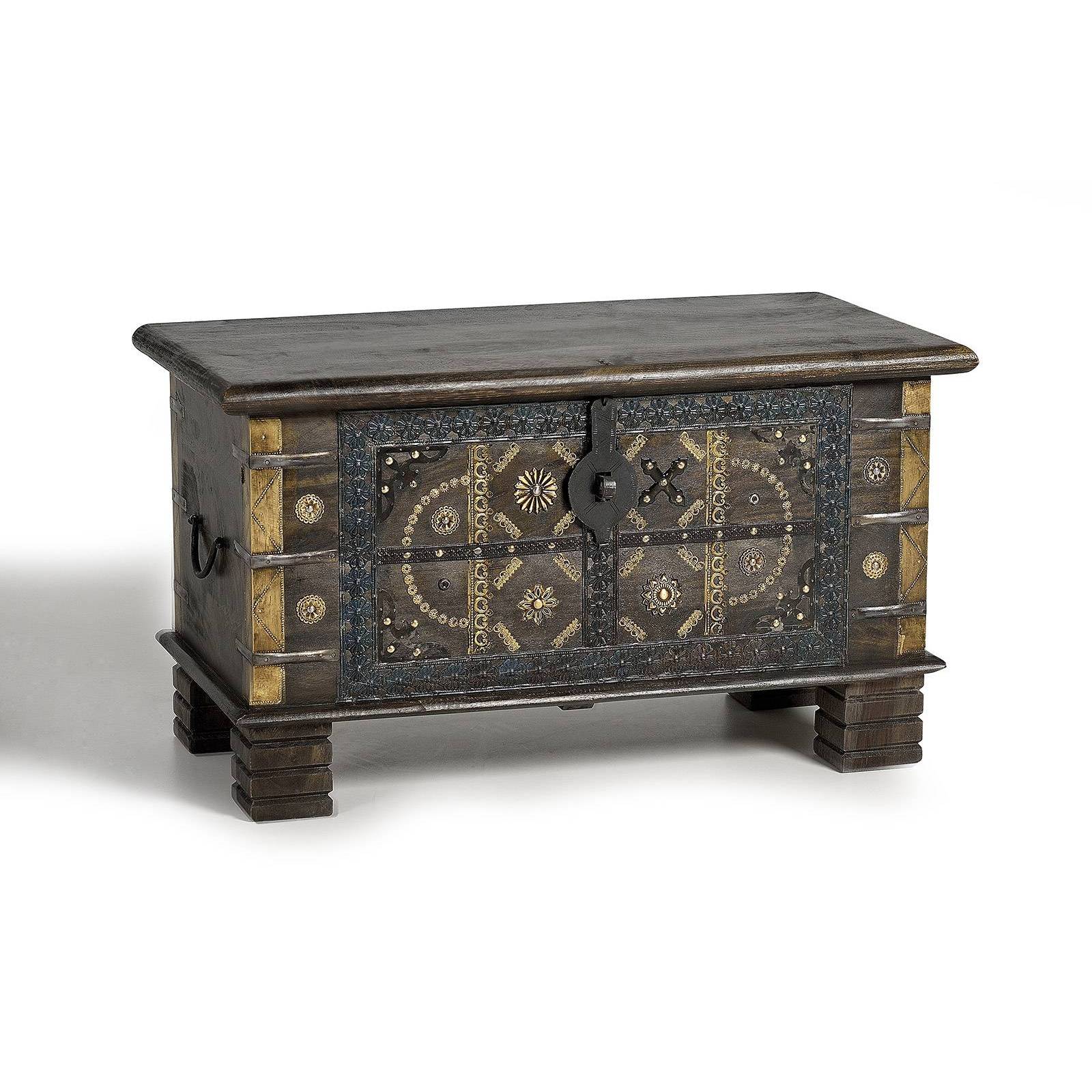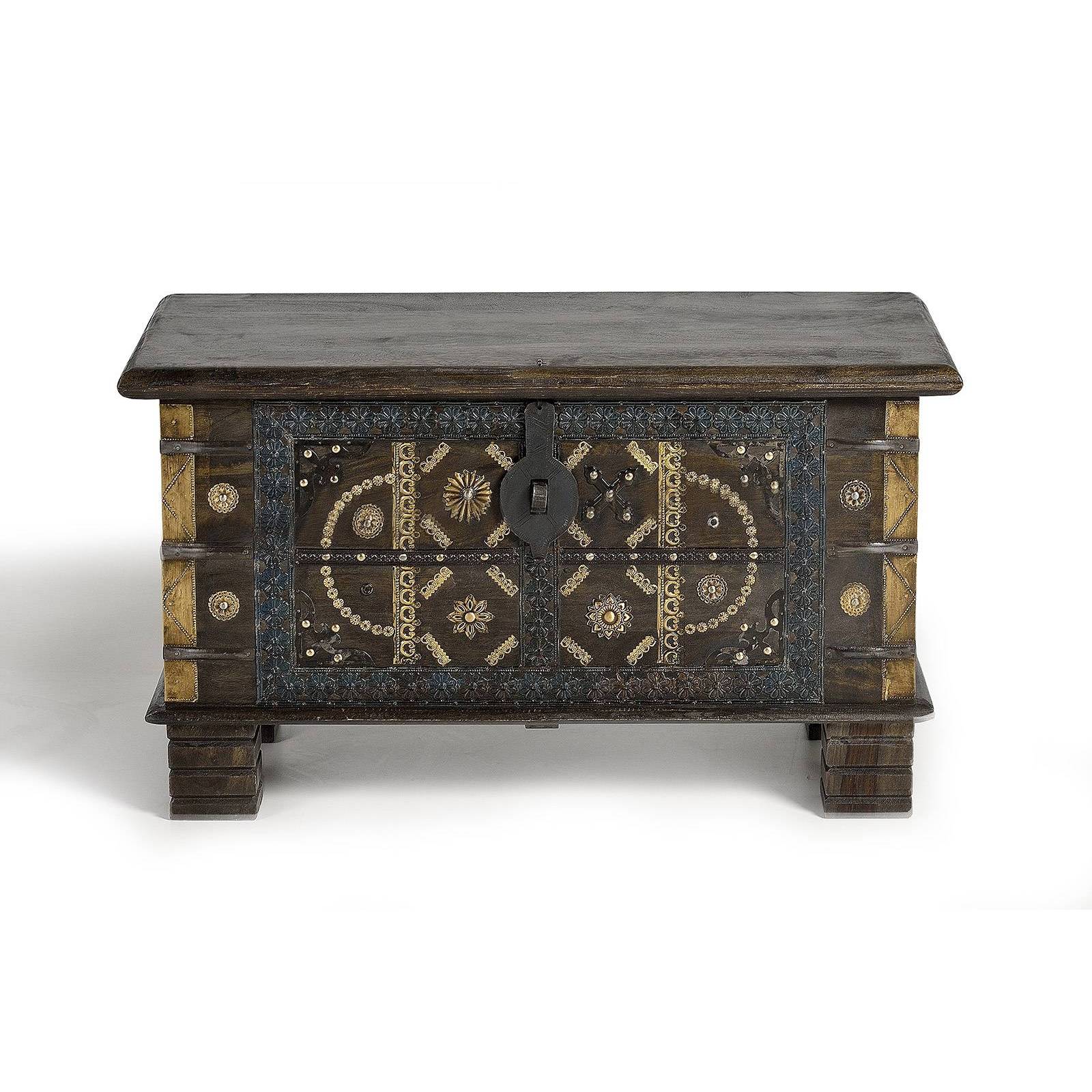 Ce magnifique petit coffre de rangement en manguier massif est orné de détails en bronze et de motifs exotiques faits main. Un meuble déco indispensable.