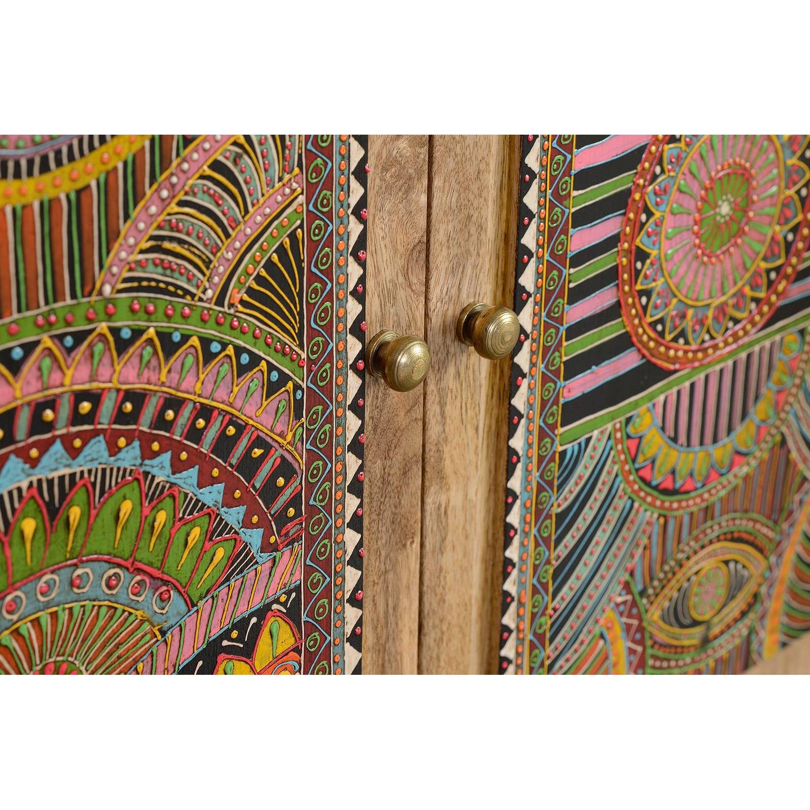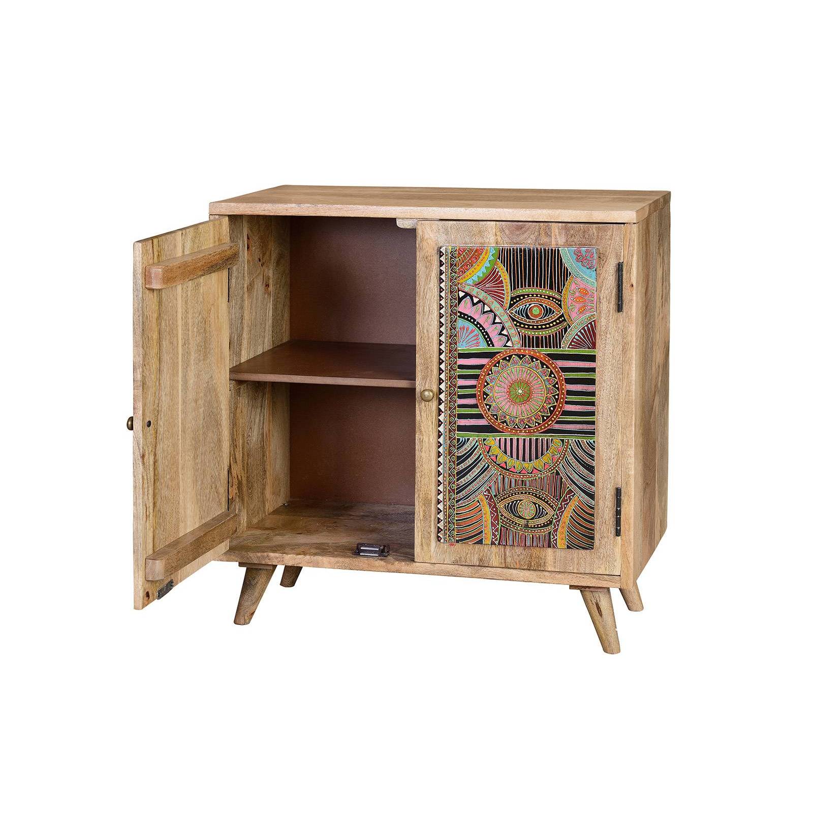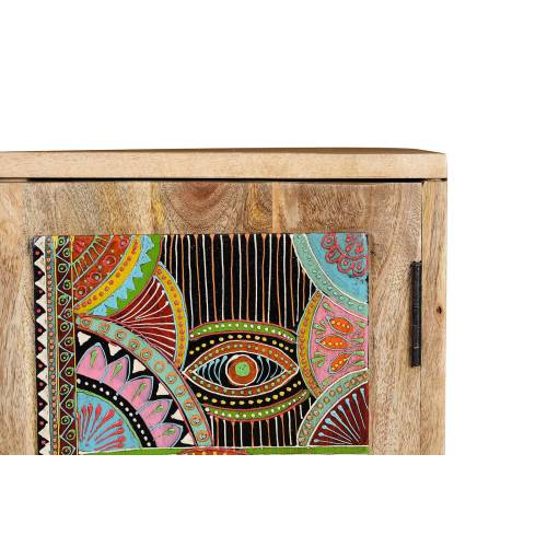 Ce petit meuble design est un meuble de qualité en bois massif. Sa face est ornée de motifs exotiques colorés ce qui en fait un meuble déco tendance.