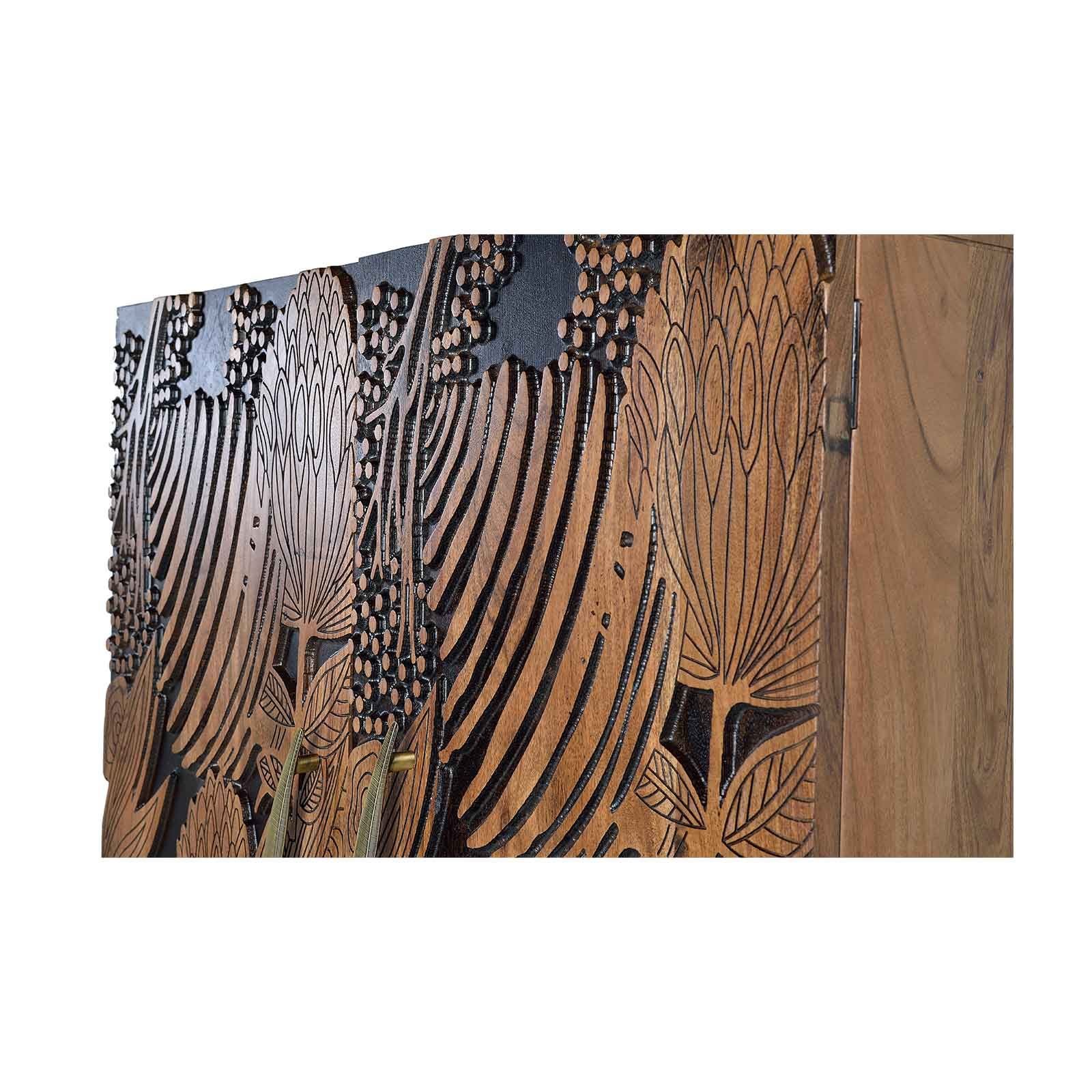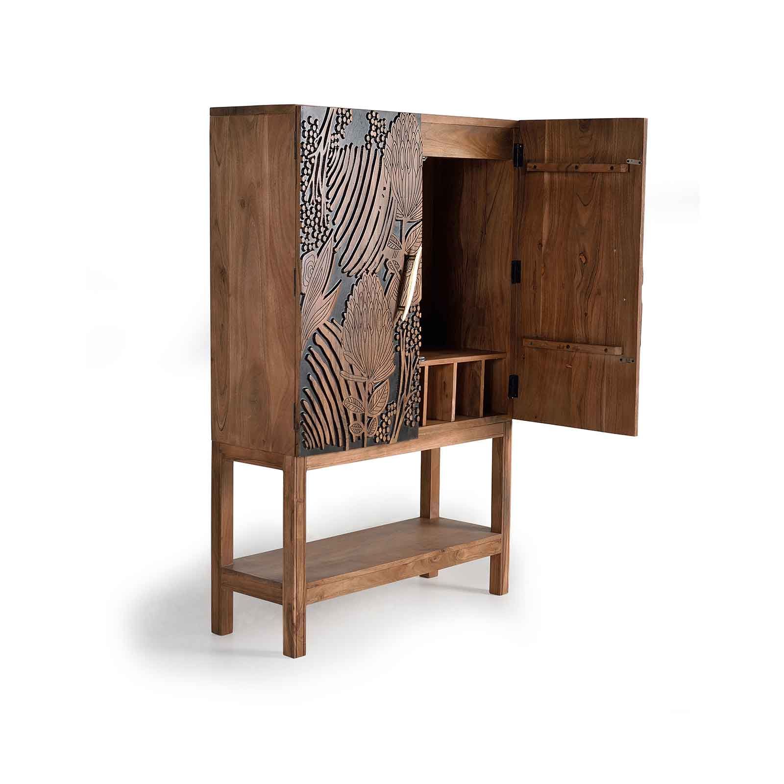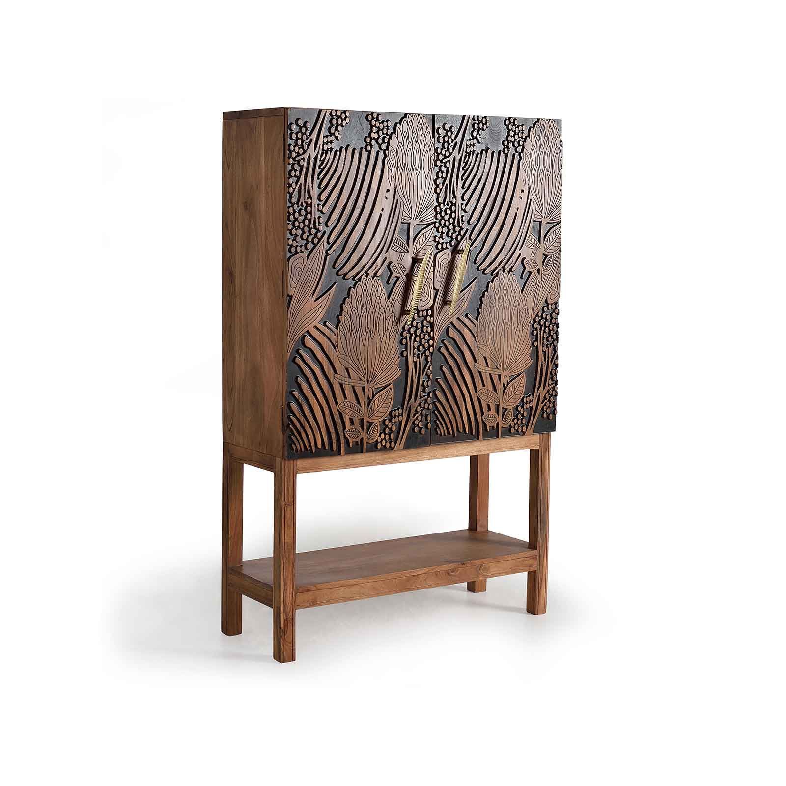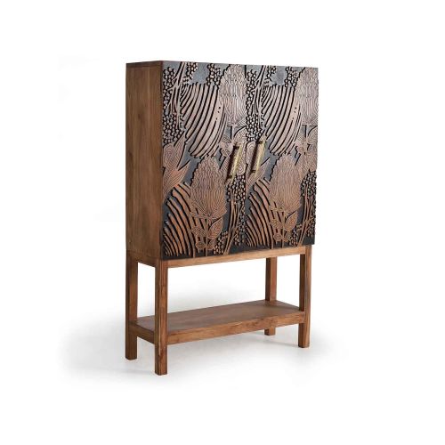 Le meuble dispose de deux portes magnifiquement sculptées à la main, qui sont de véritables œuvres d'art en elles-mêmes. Les motifs sculptés sont réalisés avec minutie et apportent une dimension artistique à l'ensemble du meuble, en ajoutant une touche de caractère unique. À l'intérieur du meuble, vous trouverez un espace de rangement bien conçu pour ranger vos bouteilles de vin, de champagne ou d'autres spiritueux. Les compartiments sont spécialement conçus pour maintenir les bouteilles en toute sécurité et les garder à portée de main pour une présentation élégante lors de vos événements spéciaux ou de vos dîners entre amis. C'est un meuble parfait pour les amateurs de vin et de design qui souhaitent ajouter une pièce unique et élégante à leur intérieur.
