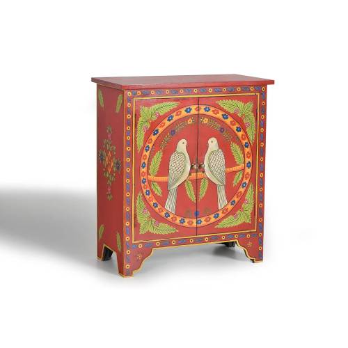Ce magnifique petit meuble de couleur rouge est en bois de manguier exotique. Ce meuble déco est peint avec des motifs exotiques très tendance.