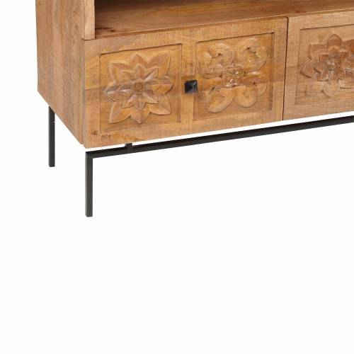 Les pieds en métal noir mat, assurent une stabilité sur le long terme tout en ajoutant une touche de modernité au design. Les sculptures à la main sur les portes, ornées de motifs floraux délicats, évoquent un sentiment d'évasion et d'aventure, ajoutant une dimension artistique et poétique à ce meuble fonctionnel. Que ce soit dans votre salon ou votre espace de divertissement, le petit meuble TV 2 tiroirs de la collection Manguier Borealis est une pièce polyvalente qui allie beauté et praticité, créant un point focal captivant dans votre décor intérieur. Avec son design soigné et ses détails exquis, ce meuble est un véritable hommage à l'artisanat traditionnel et au charme intemporel du bois massif.