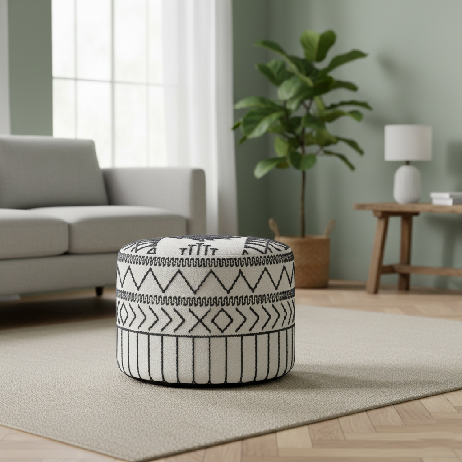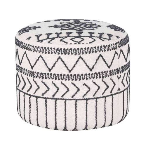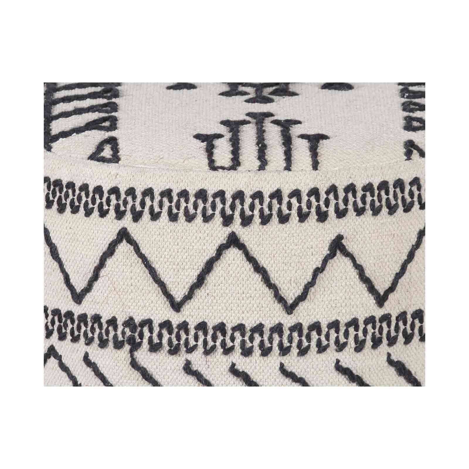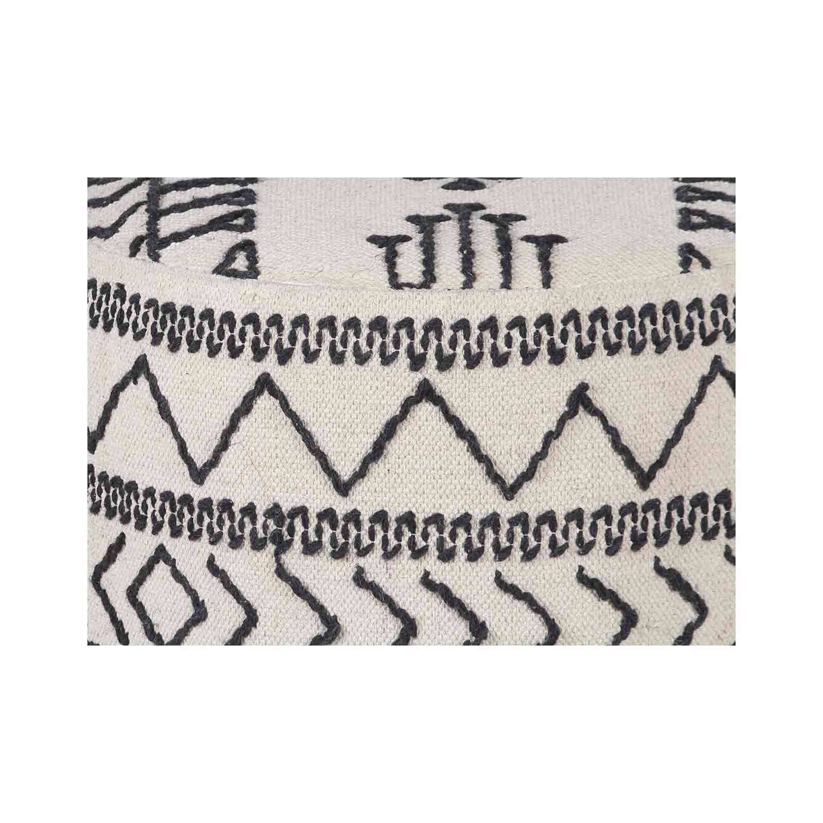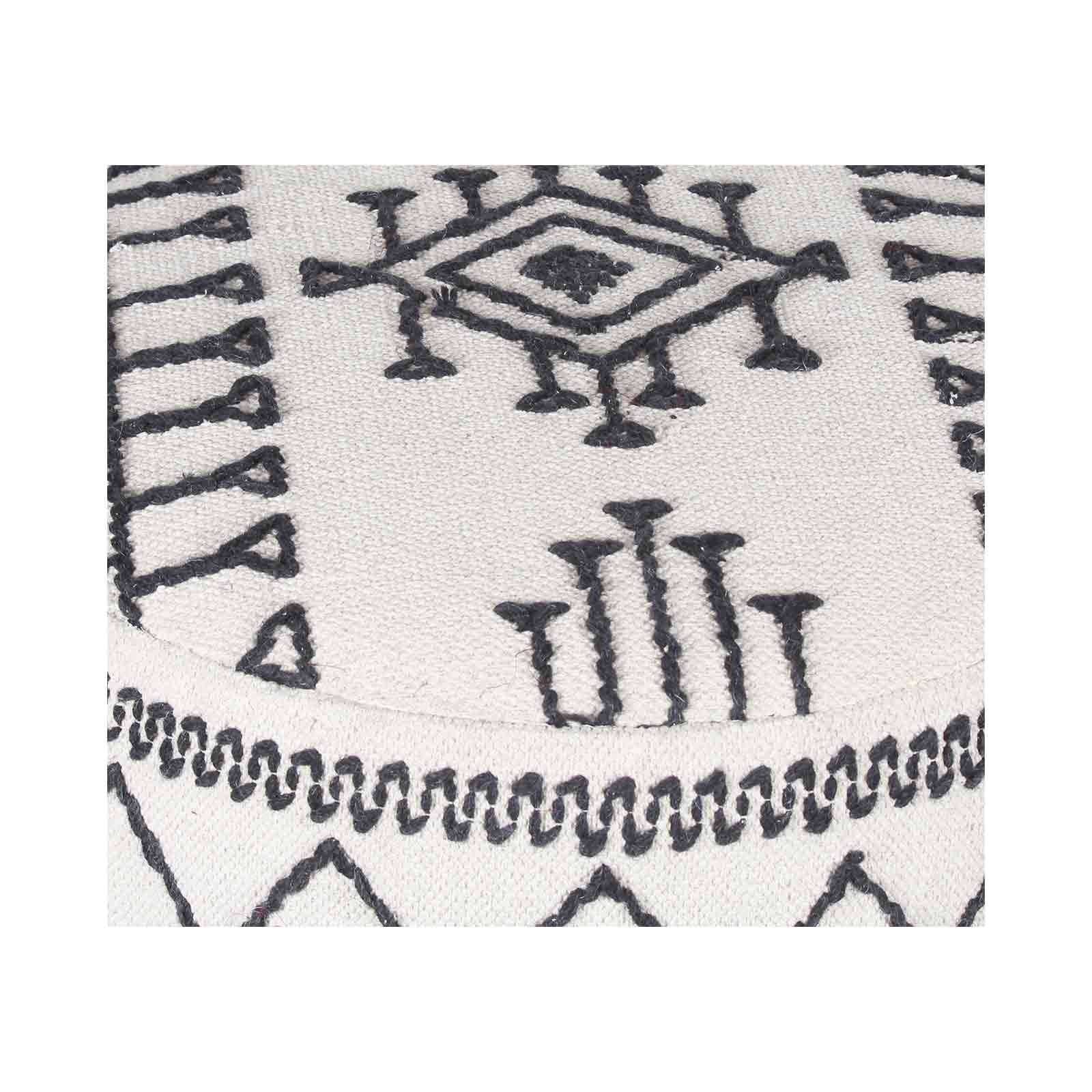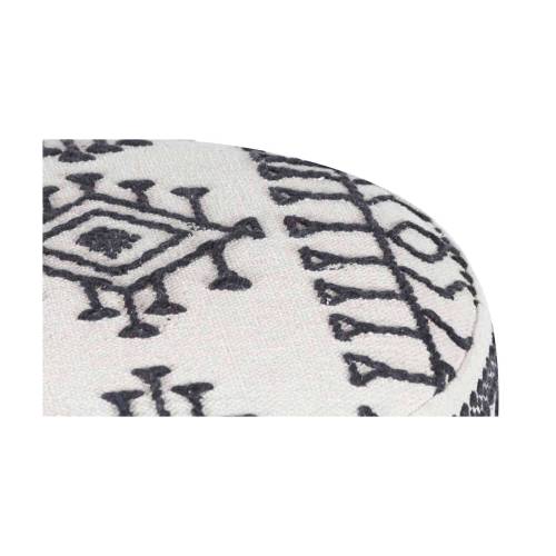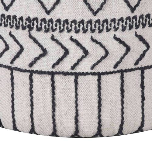 La structure en acacia massif offre une base solide, mettant en valeur la richesse du bois naturel. La véritable singularité de ce pouf réside dans son revêtement en coton kilim, entièrement recouvert à la main. Les motifs tribaux, brodés en noir sur un fond blanc, créent une composition visuelle unique et authentique. Avec une hauteur de 45 cm, ce pouf offre une assise confortable tout en pouvant servir de repose-pieds ou même de petite table d'appoint.