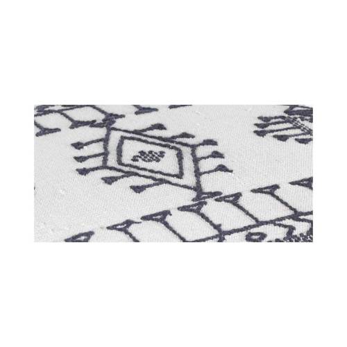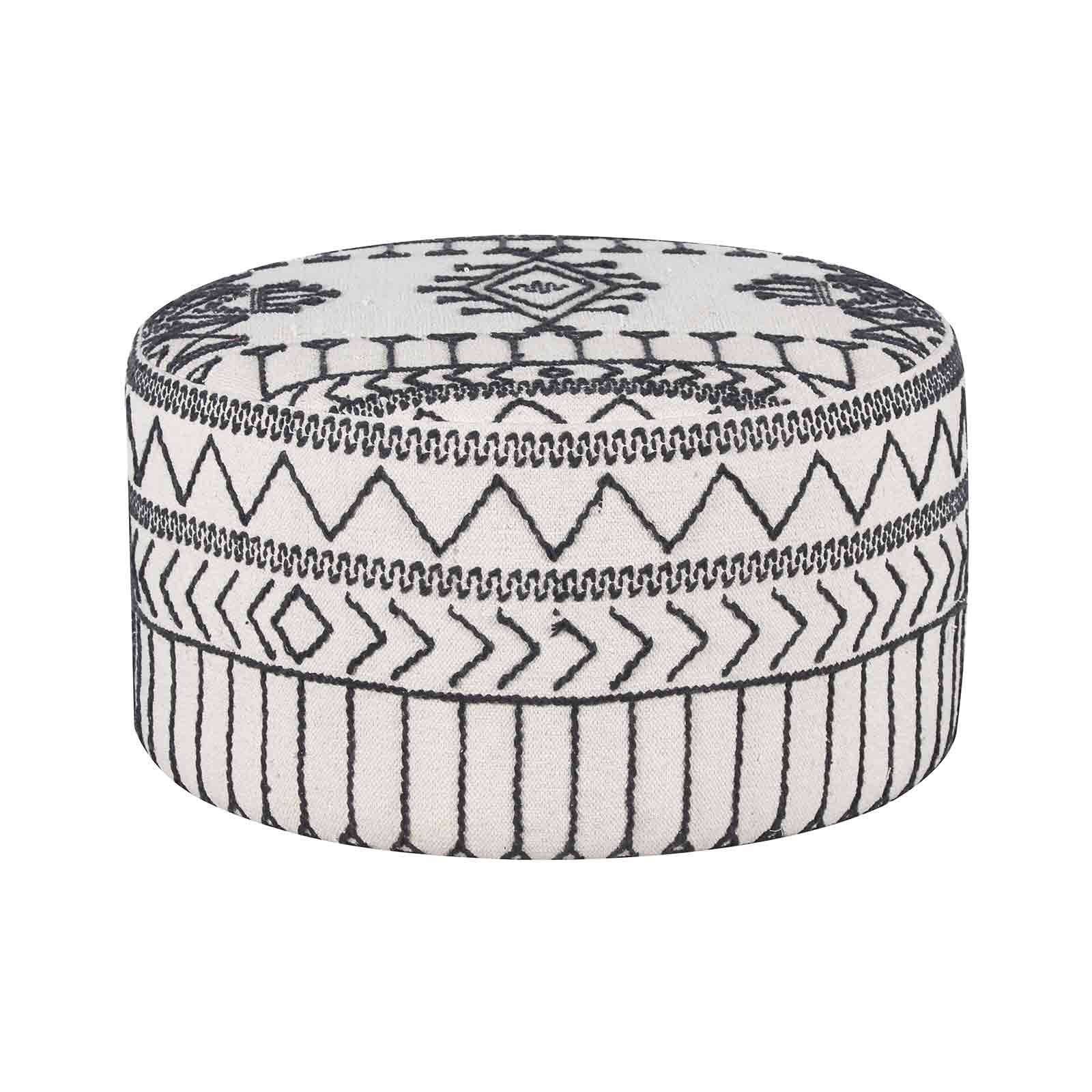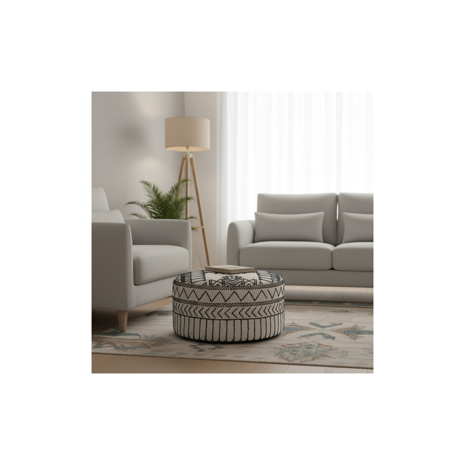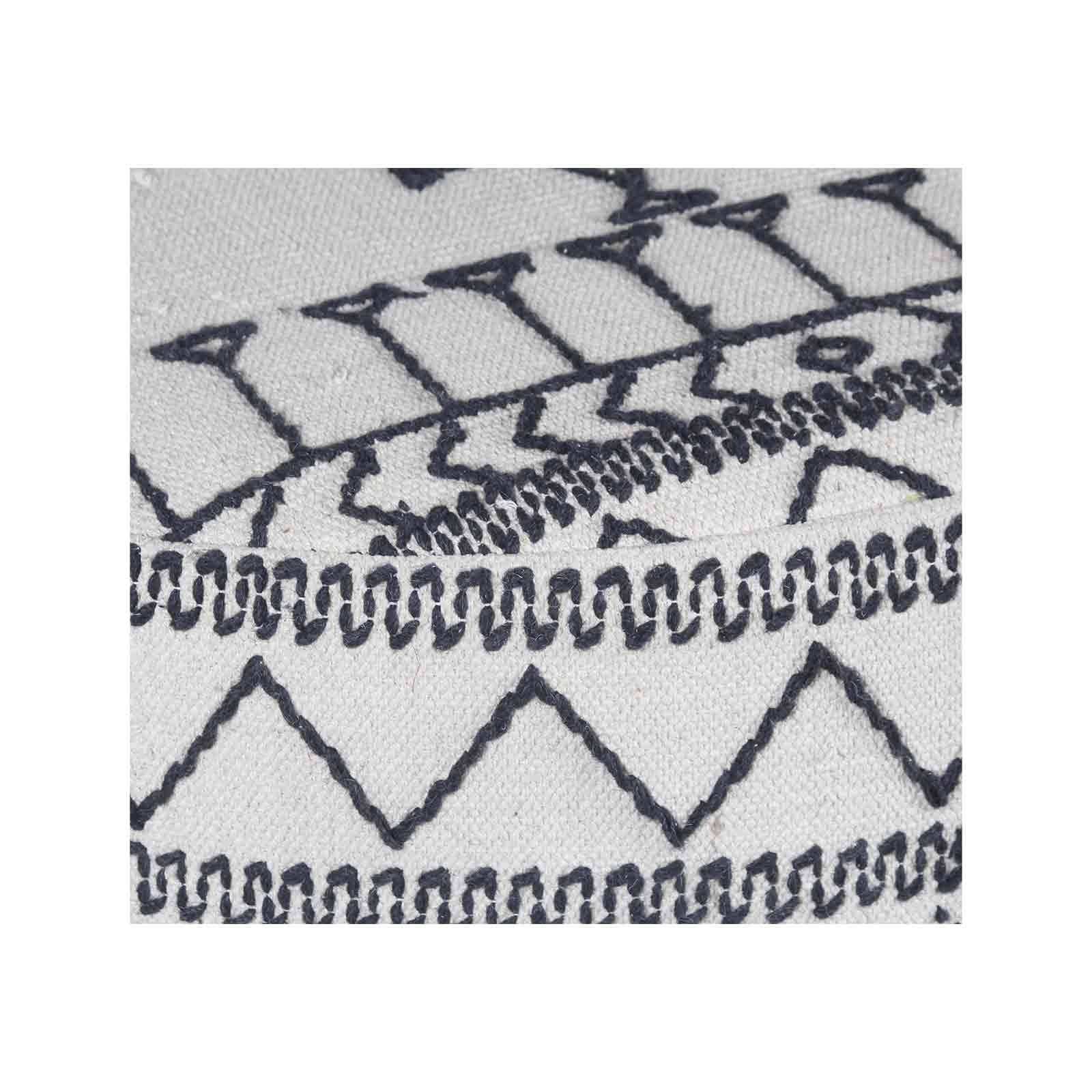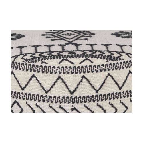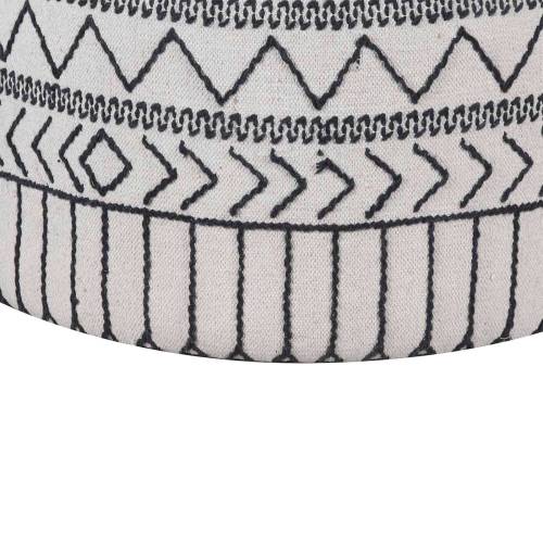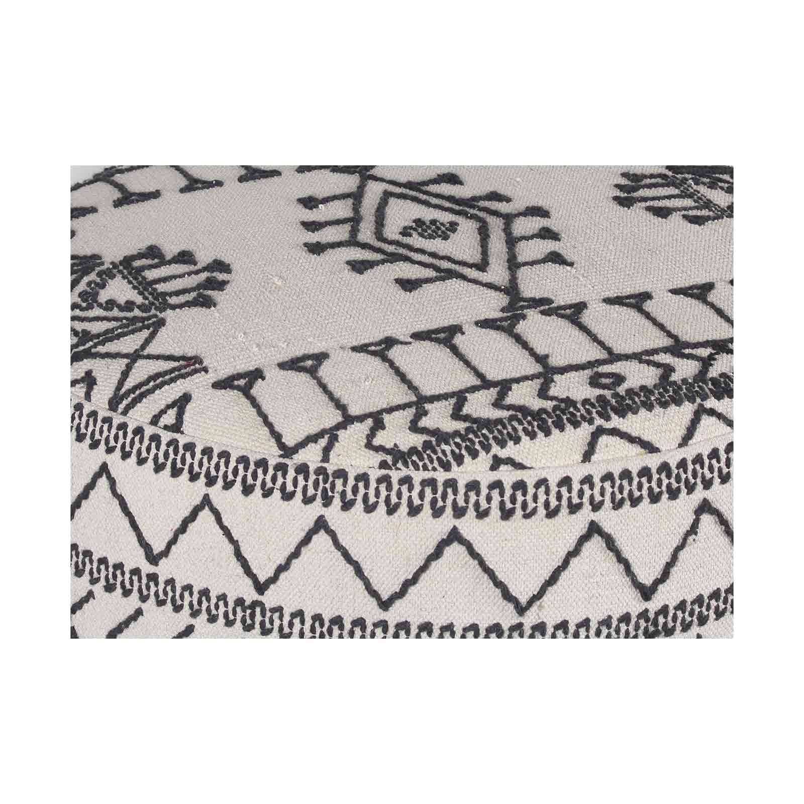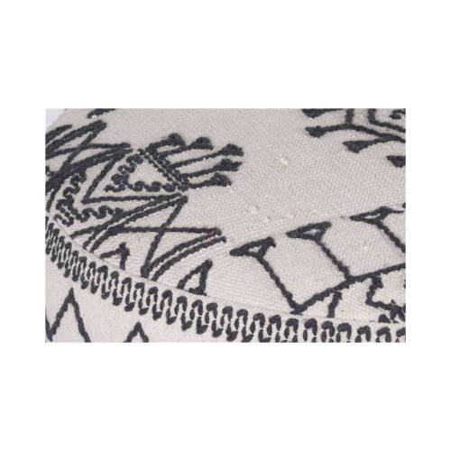Le pouf tribal rond 90 cm est fabriqué avec une structure en acacia massif recouverte de coton kilim blanc avec des broderies noires faites main.