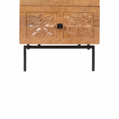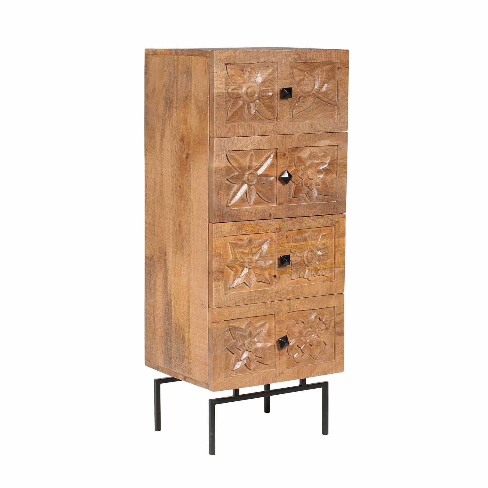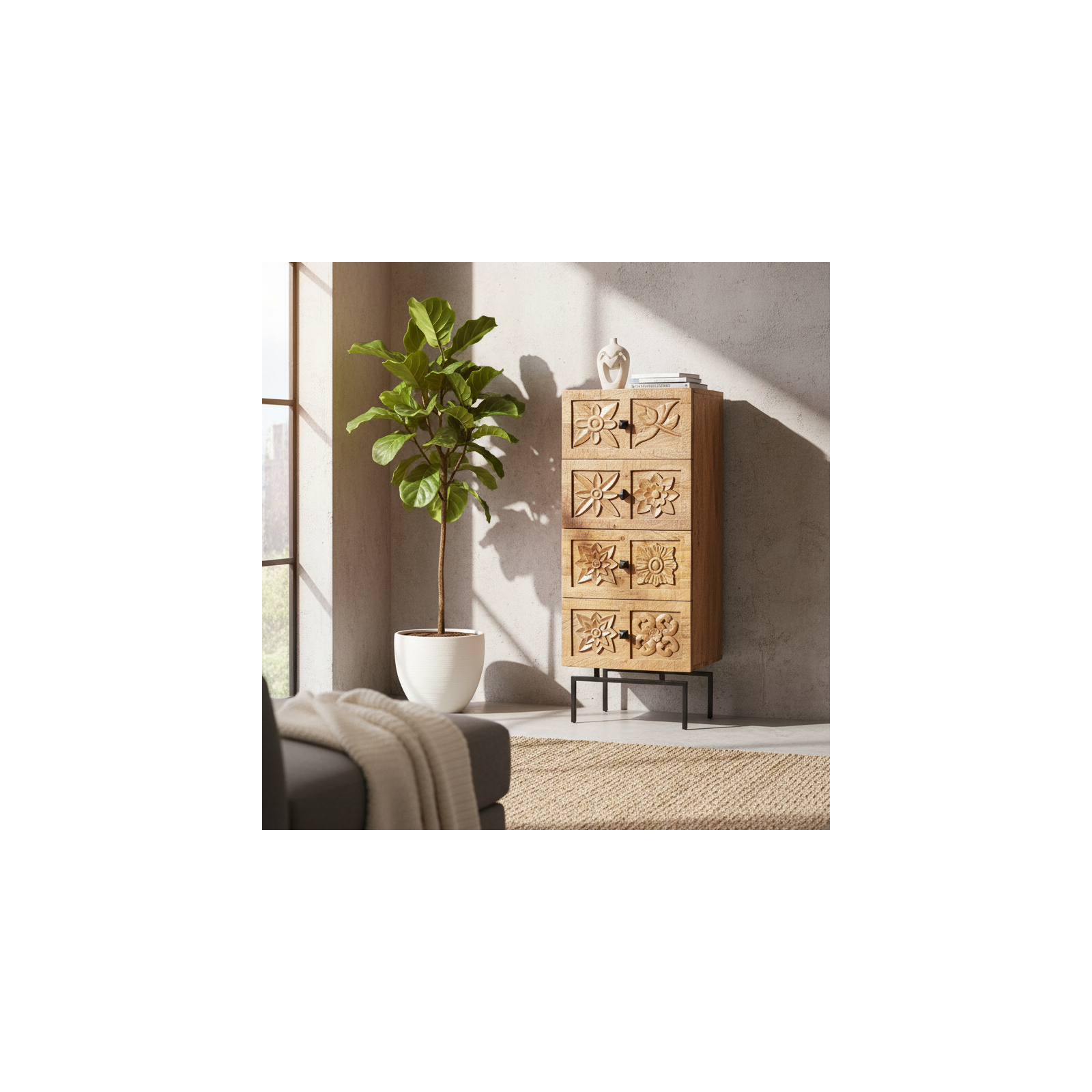 Sa structure solide en bois massif de manguier, offre une stabilité remarquable et une beauté authentique. La finition naturelle met en valeur le bois, ajoutant une touche de chaleur et d'authenticité à votre intérieur. Avec quatre tiroirs spacieux, ce semainier offre un espace de rangement généreux pour vos vêtements, vos accessoires ou vos objets personnels. Les sculptures délicates réalisées à la main sur les tiroirs, avec des motifs floraux évocateurs, ajoutent une touche artistique et poétique à la pièce, invitant à l'évasion et au voyage.