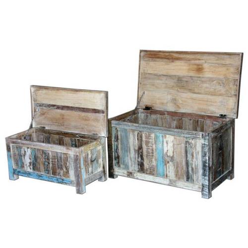 Offrez-vous ce superbe set de deux coffres en bois massif et donnez un style exotique à votre intérieur ! Ces deux coffres sont entièrement composés de bois recyclé, du manguier. Ainsi, il s'agit de déco écologique puisque le bois d'anciens bateaux et d'anciennes constructions est valorisé. Ce faisant, les meubles fabriqués à partir de ce bois portent en eux une véritable histoire et leur apparence témoigne de leur vie passée. Chaque exemplaire est unique !