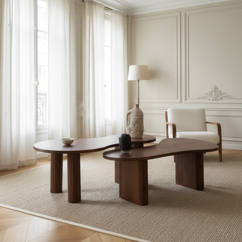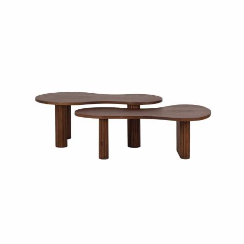 La plus grande des deux tables est soutenue par trois pieds robustes, tandis que sa compagne plus petite repose sur deux, offrant une dynamique visuelle subtile qui évoque l'harmonie naturelle. Livrées avec les pieds démontés, ces tables offrent une flexibilité lors de l'installation, vous permettant de les adapter à votre espace avec aisance. La teinte marron clair de l'acacia massif confère à ces tables basses une finition authentique, mettant en valeur la beauté naturelle du matériau.