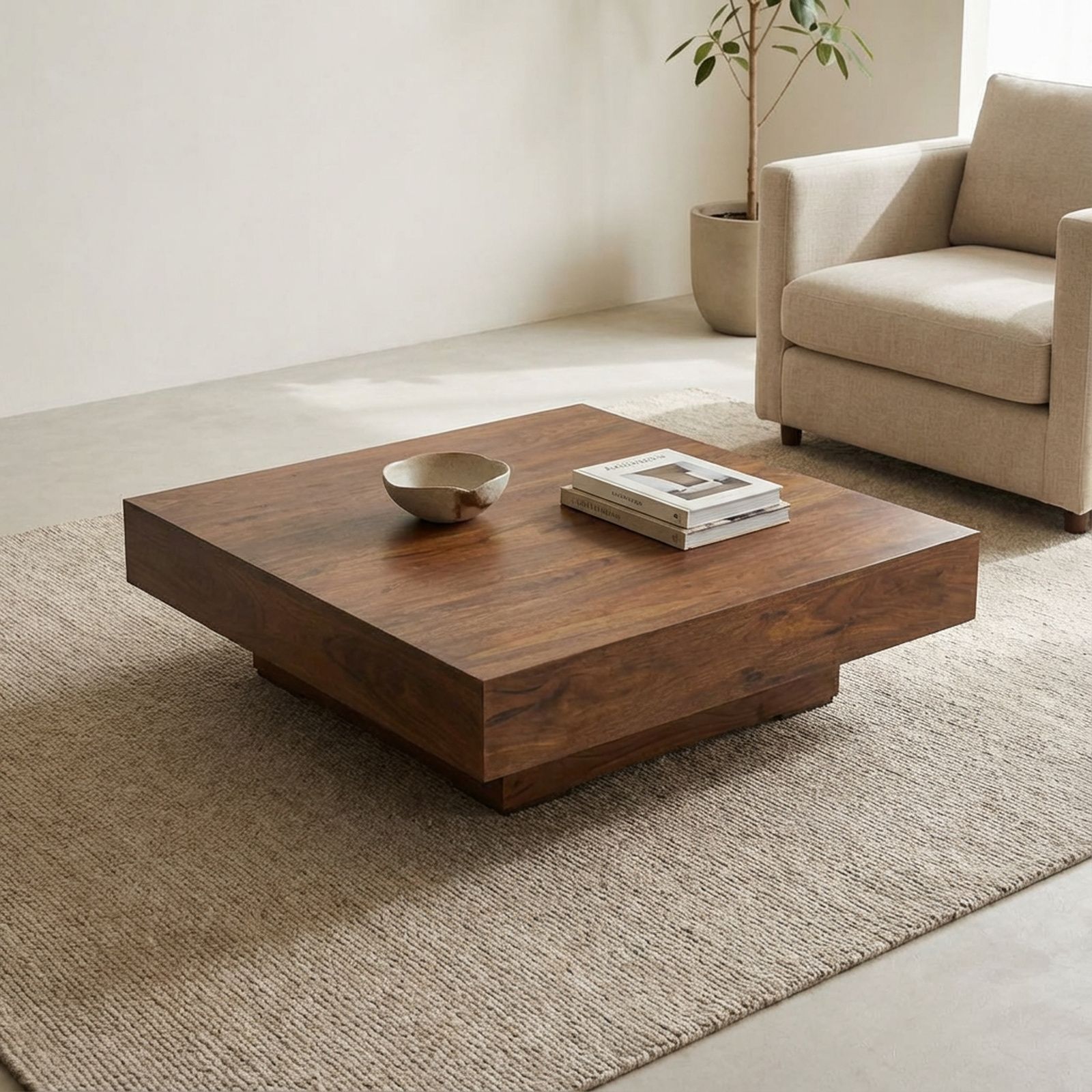 Cette belle table basse carrée design en bois de palissandre massif ornera avec élégance votre salon et lui donnera un esprit contemporain du fait de ses lignes minimalistes.