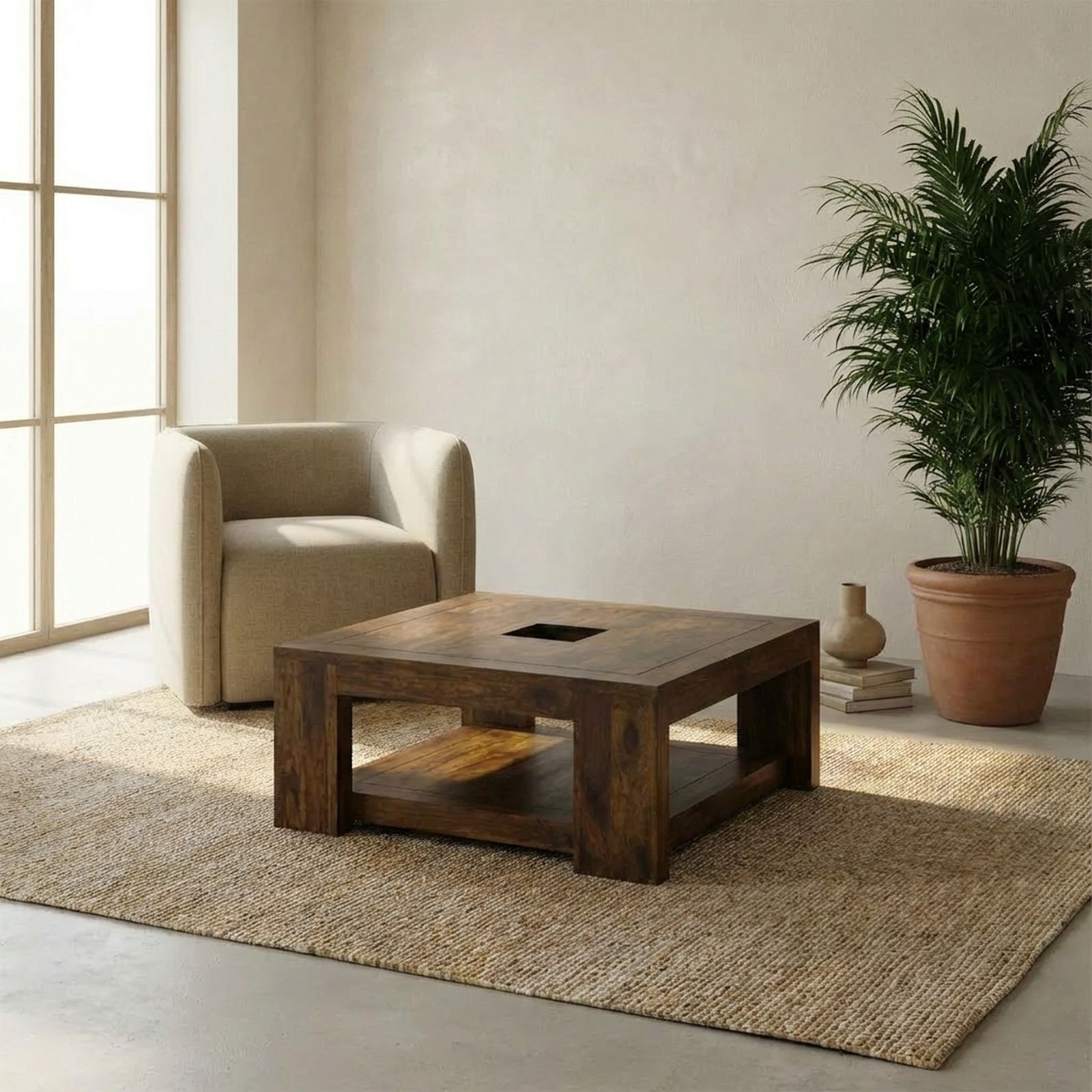 Son plateau supérieur présente un carré sculpté décoratif en son centre, participant à lui donner un côté contemporain. Pratique, son plateau inférieur vous offrira la possibilité de ranger à l'abri des regards vos objets du quotidien telles que vos revues.