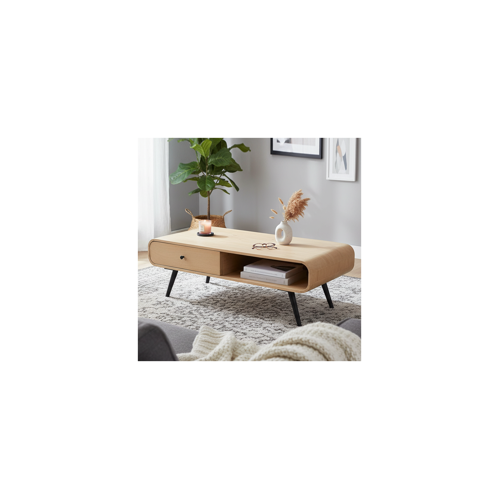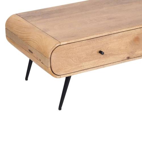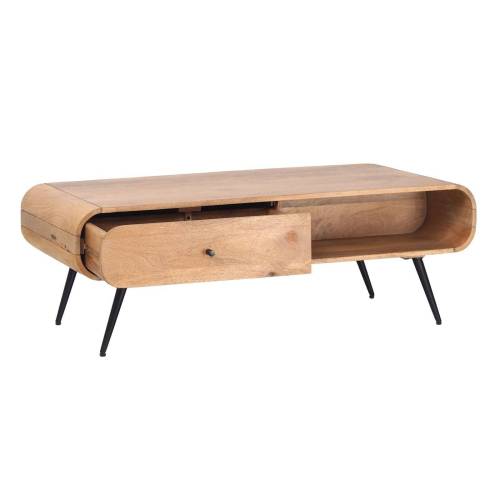 La table basse dispose d'un tiroir de rangement pratique, offrant une solution idéale pour garder vos essentiels de salon organisés et à portée de main. Les bords arrondis lisses et les pieds en métal noir élégants rehaussent l'esthétique moderne de la table, tout en garantissant stabilité et durabilité. Avec son design polyvalent, cette table basse complète facilement une variété de styles d'intérieur, du moderne à l'industriel.