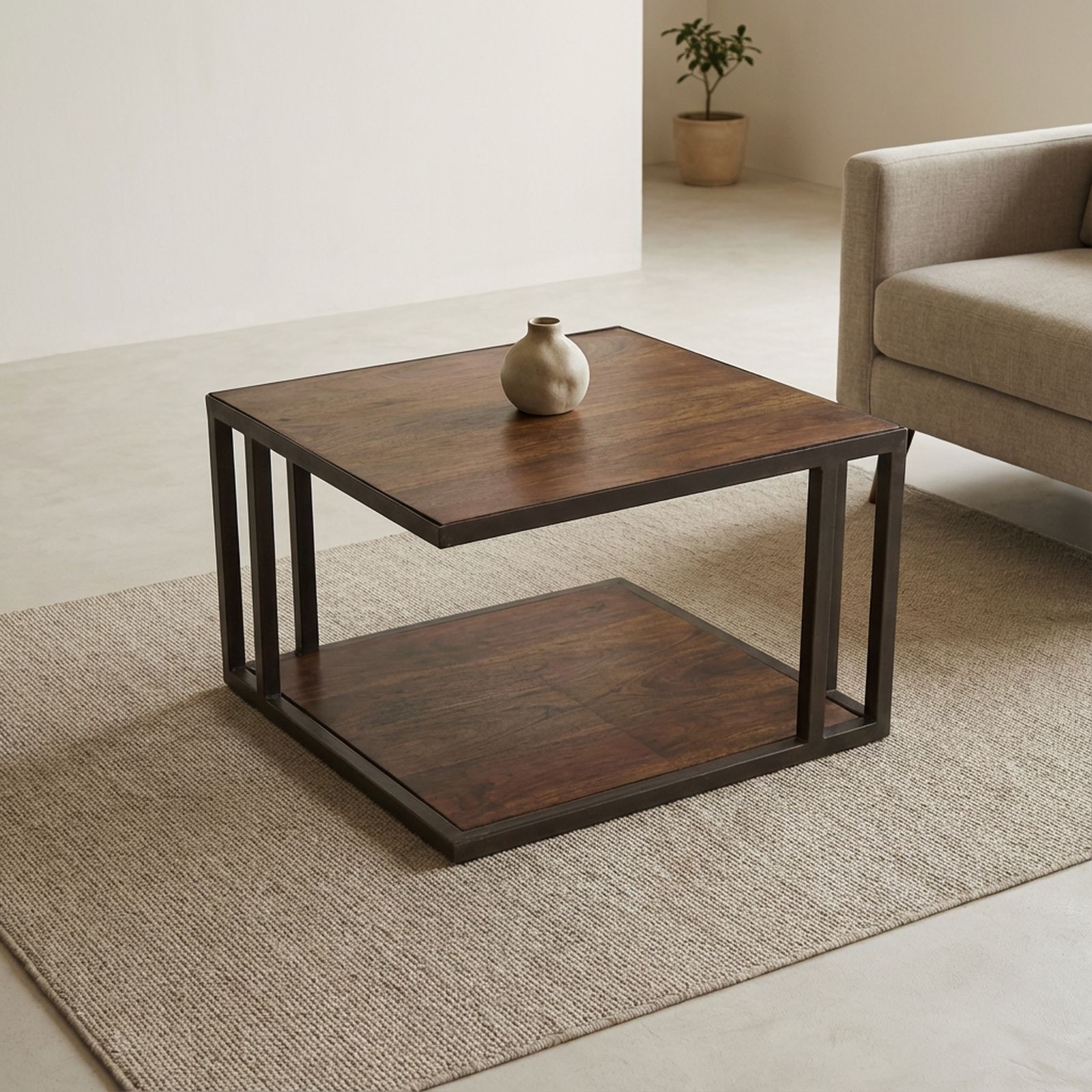 Cette très belle table basse en bois exotique et fer forgé est typique du mobilier à l'esprit loft. Ses formes design sont très originales !