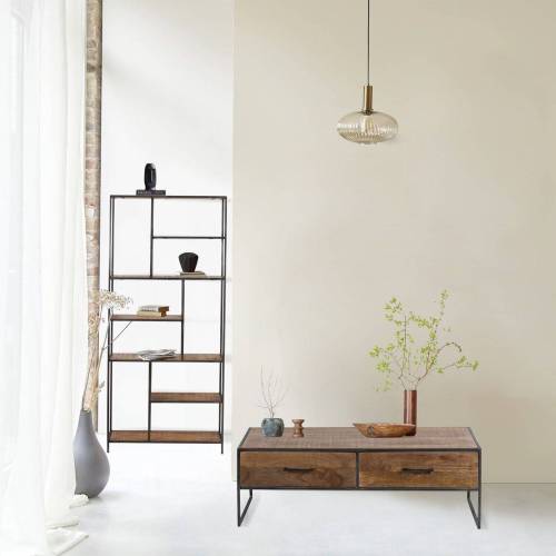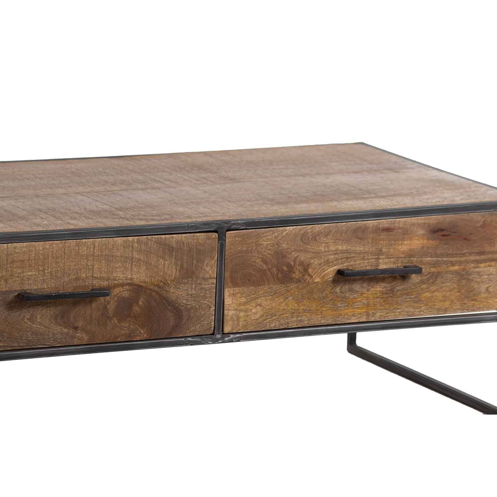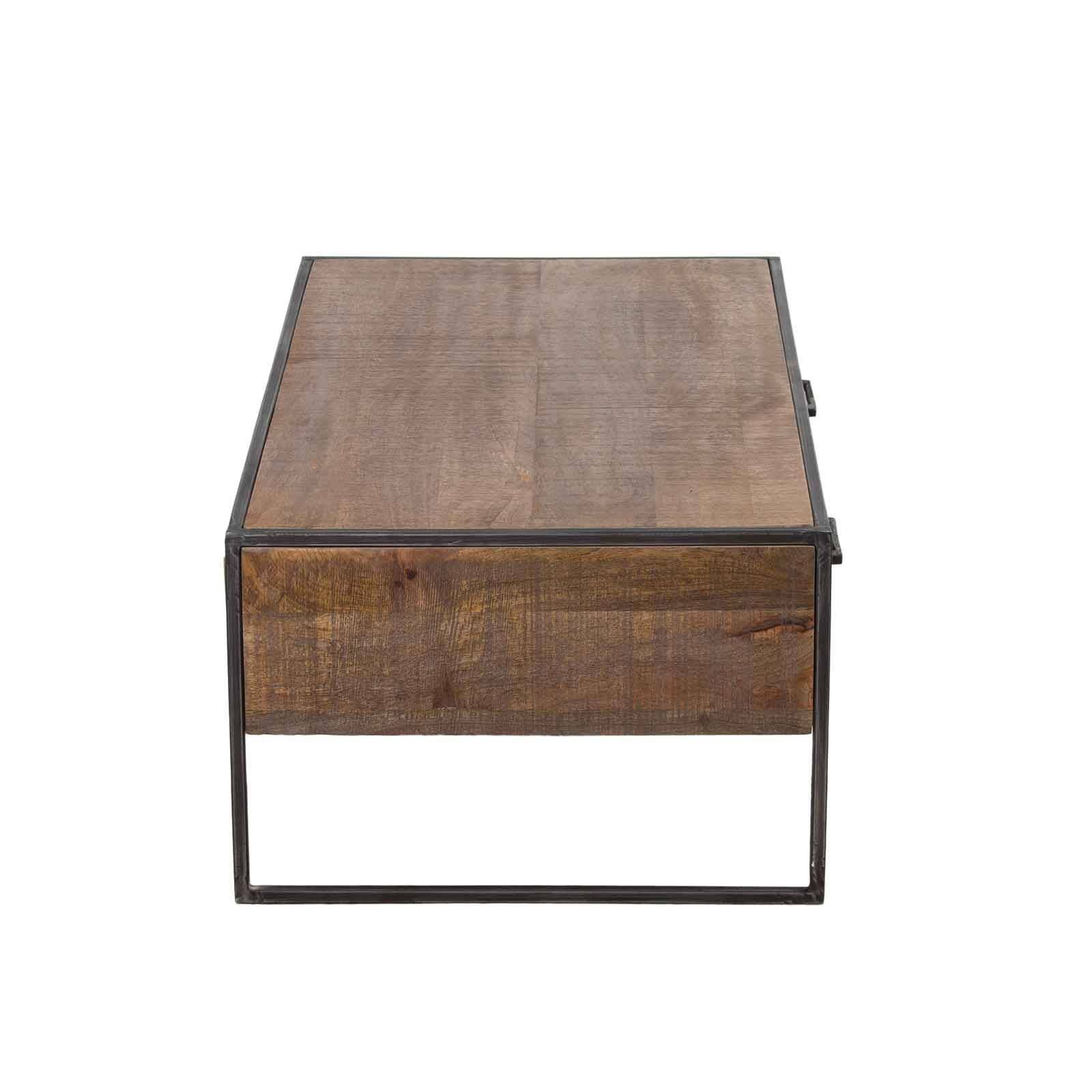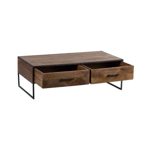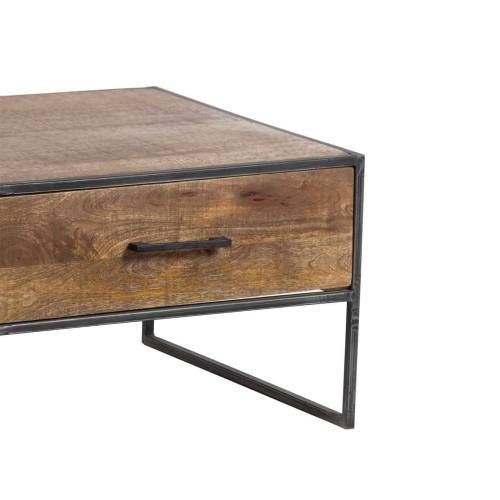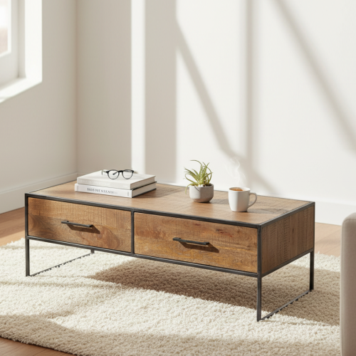 La table basse tiroirs en manguier massif et métal incarne le mariage parfait entre l'esthétique industrielle et la robustesse contemporaine.