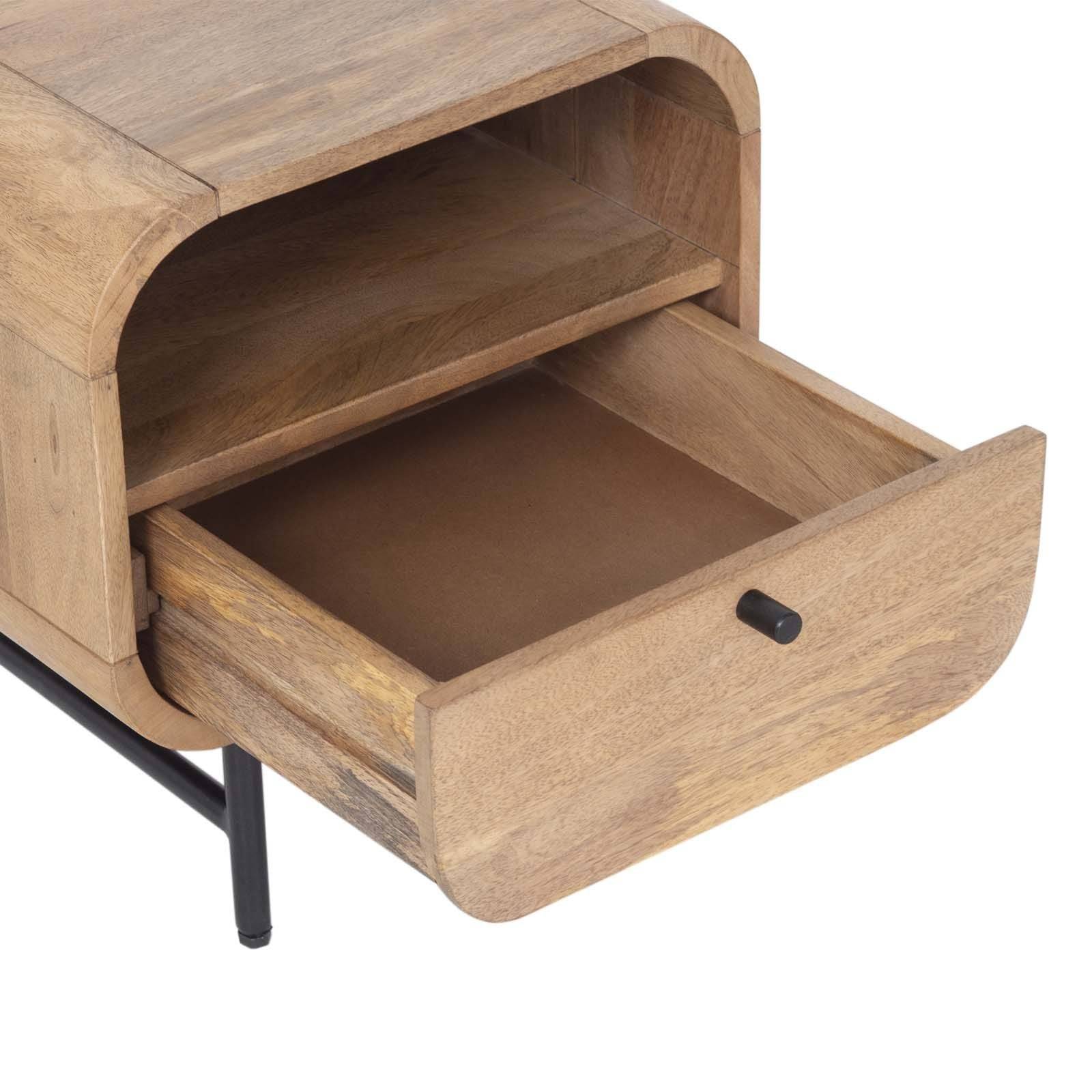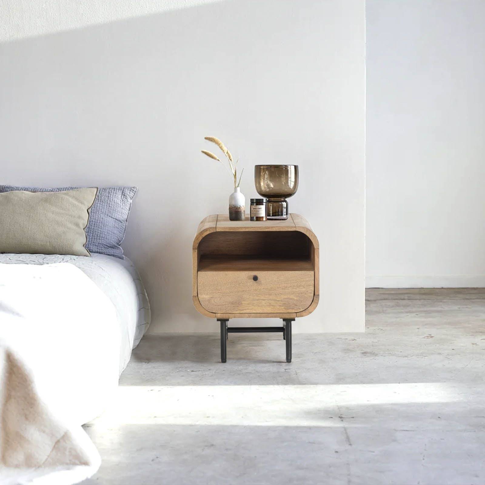 Enhance your bedroom with the Contemporary Mango Wood Bedside Table with Drawer from the Maidi Collection. This elegant piece combines modern design and natural materials, creating a striking addition to any bedroom decor. Crafted from high-quality mango wood, this bedside table features a smooth finish that highlights the rich grain and warm tones of the wood, adding a touch of natural beauty to your home.