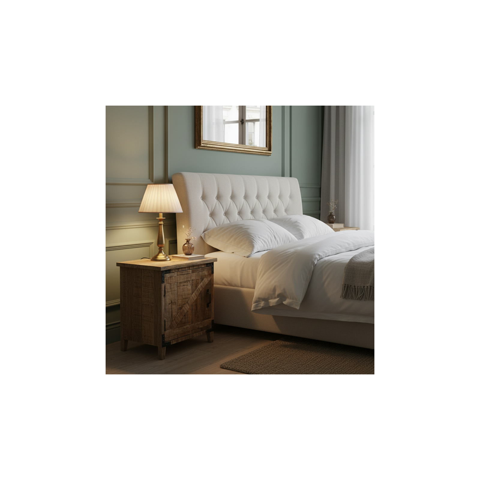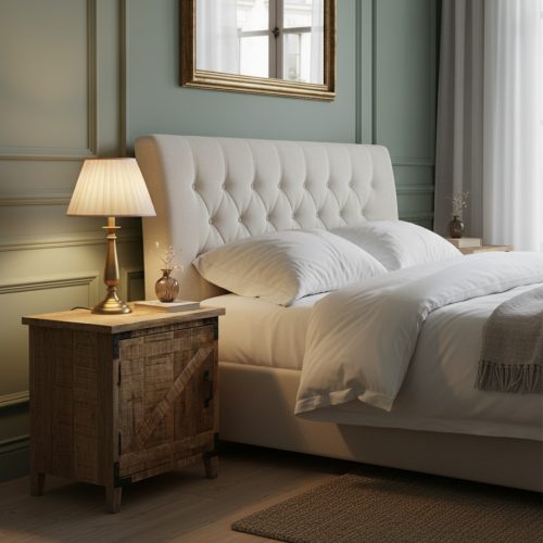 La table de chevet dispose d'une porte à ouverture droite, offrant un espace de rangement pratique pour vos effets personnels. La possibilité de choisir entre une ouverture droite ou gauche ajoute une dimension personnalisée à cette pièce fonctionnelle. L'effet brut de sciage, délibérément intégré dans le design, confère à la table de chevet une esthétique brute et authentique. Chaque rainure et aspérité rappelle l'origine artisanale du bois, créant une pièce unique chargée d'histoire et de caractère.