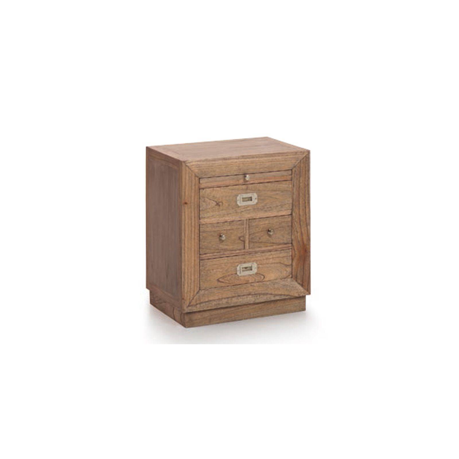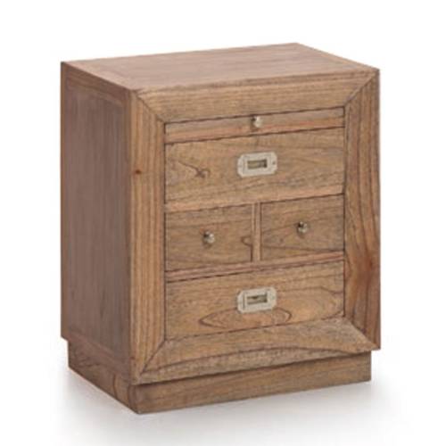 Les lignes épurées de ce joli chevet en bois massif et son épais socle rectangulaire lui donnent une allure vraiment unique et un style contemporain très tendance. À cela s'ajoute un caractère exotique lié au bois même puisqu'il s'agit de mindy, une essence cultivée en Indonésie et qui possède un veinage marqué, mis ici en valeur par une céruse grisée. Les poignées en laiton vieilli de ce chevet participent quant à elle à faire un clin d'oeil au mobilier de style colonial.