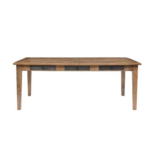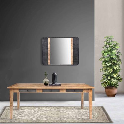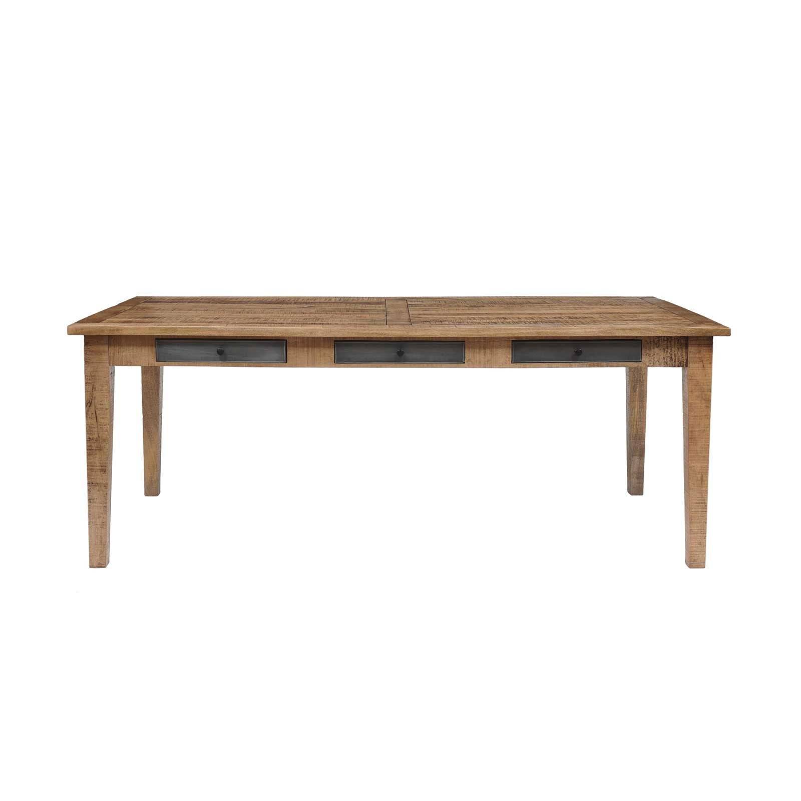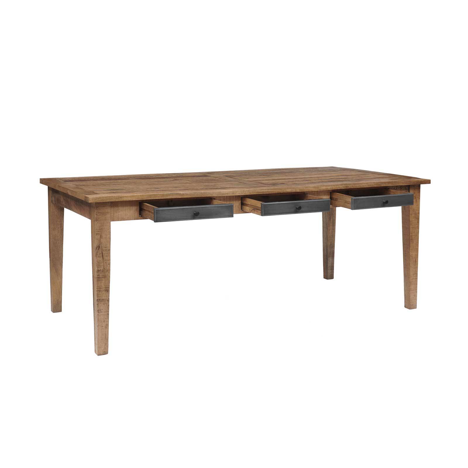 Le coloris brun/miel enveloppe la table, mettant en valeur la richesse naturelle du bois de manguier massif. Soutenu par des panneaux en MDF, le meuble bénéficie d'une robustesse remarquable, assurant une stabilité durable pour les repas en famille et entre amis. La table de repas est dotée de 6 tiroirs astucieusement intégrés, offrant un espace de rangement pratique pour couverts, nappes ou autres accessoires de table. Les façades des tiroirs en métal ajoutent une touche moderne et industrielle, créant un contraste visuel saisissant.