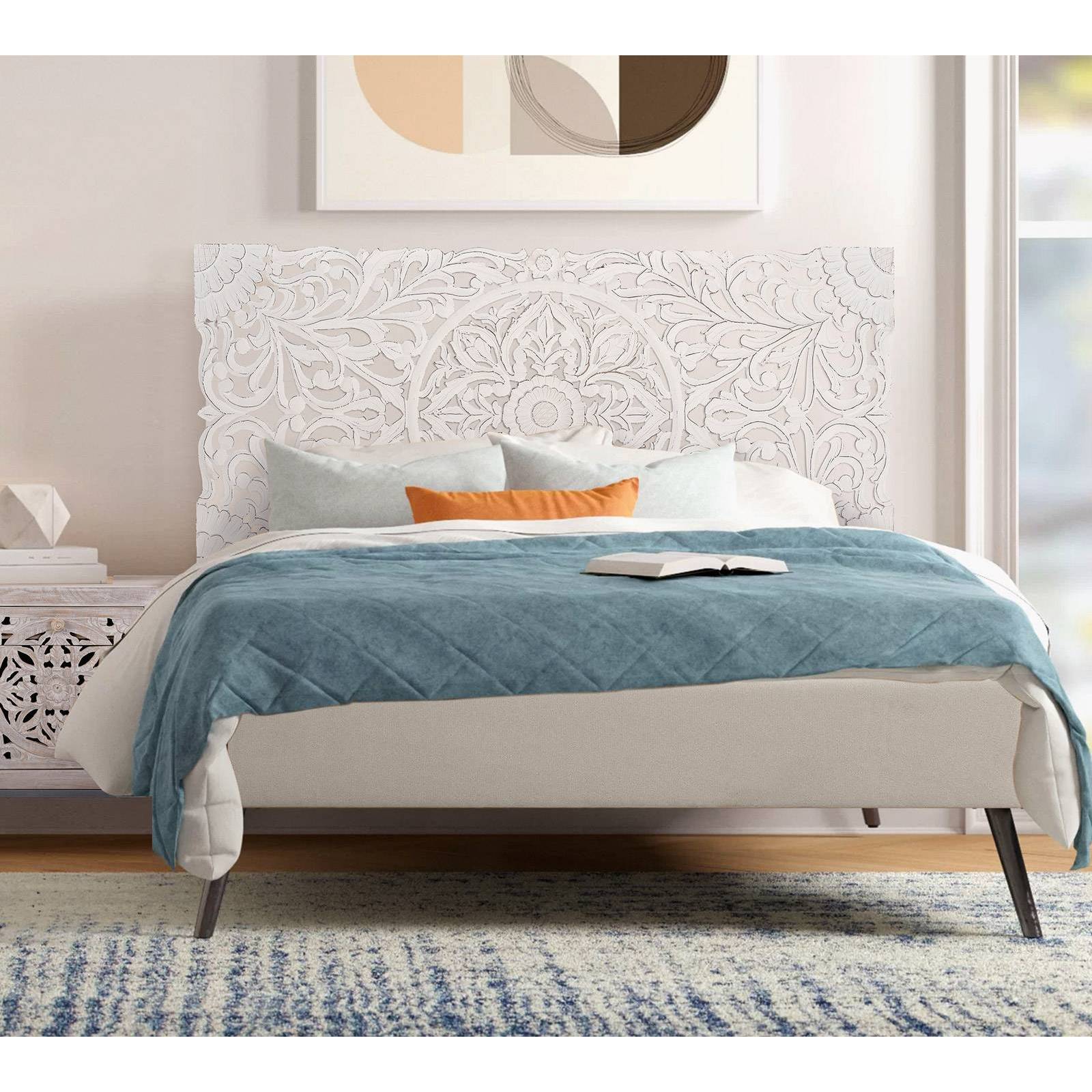 Lire les 2 avis Cette tete de lit en bois blanc en MDF imitation manguier apportera de la clarté à votre chambre. Un meuble déco exotique et chic sculpté à la main.