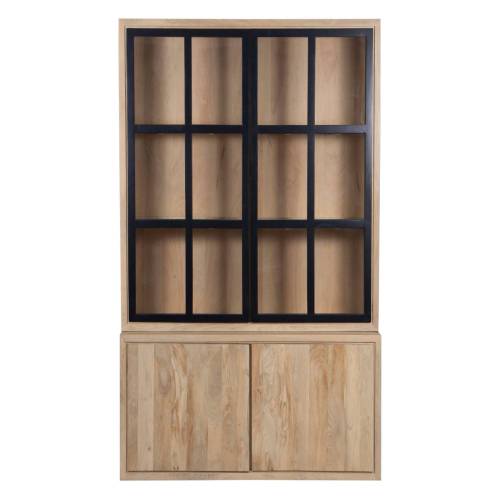 La partie supérieure est composée de deux grandes portes vitrées encadrées en noir mat, offrant un contraste raffiné et permettant de mettre en valeur vaisselle, verrerie ou objets décoratifs sur des étagères spacieuses. En partie inférieure, deux portes pleines dissimulent un rangement généreux pour les objets du quotidien.