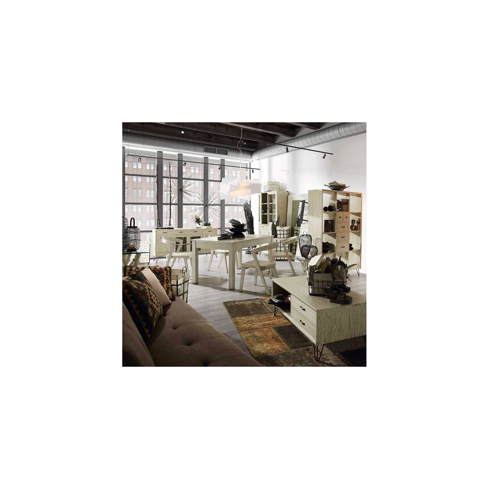 Cette belle vitrine Malaga est composée de bois exotique massif, du mindi. Cérusé et teint en une belle couleur crème, le bois se marie parfaitement avec le métal des poignées et des pieds. Ces derniers sont d’ailleurs particulièrement originaux, puisqu’ils font un clin d’œil au mobilier rétro. Cela allonge la silhouette de cette vitrine pour lui donner encore plus de charme !